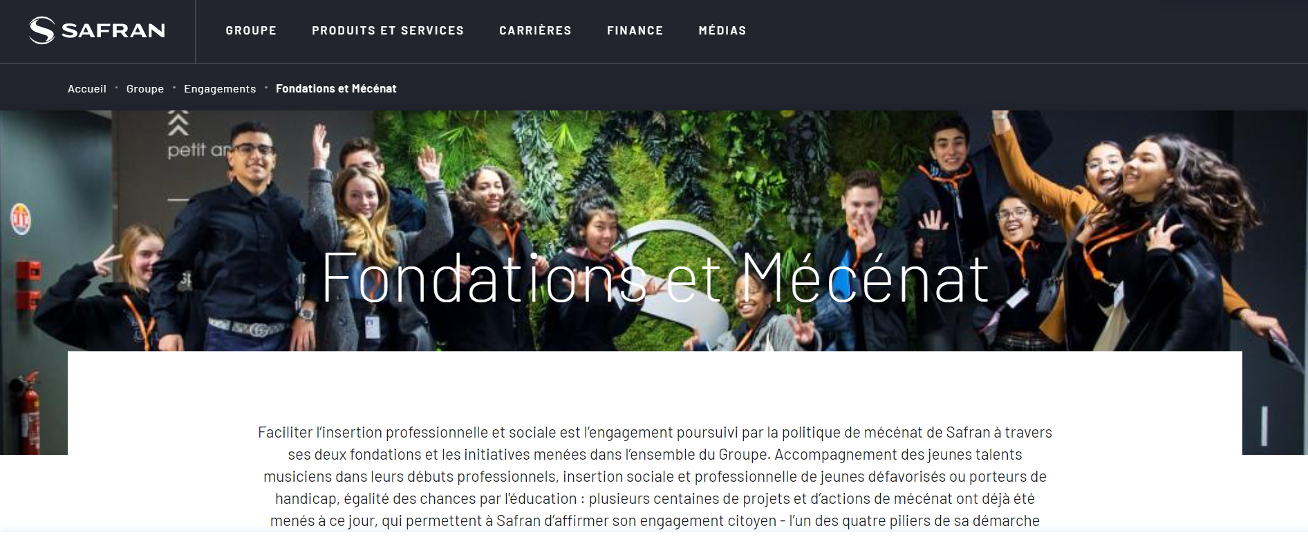 Faciliter l’insertion professionnelle et sociale est l’engagement poursuivi par la politique de mécénat de Safran à travers ses deux fondations et les initiatives menées dans l’ensemble du Groupe. Accompagnement des jeunes talents musiciens dans leurs débuts professionnels, insertion sociale et professionnelle de jeunes défavorisés ou porteurs de handicap, égalité des chances par l’éducation.